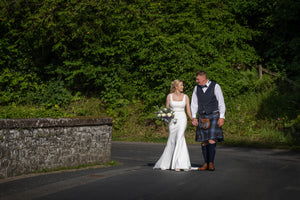 This photo captures a beautiful moment from a Scottish wedding we attended. In this image, Jack is wearing a traditional kilt outfit that exudes Scottish pride and elegance. His kilt, in a deep tartan pattern called "The Skirl" it is complemented by a mid blue Waistcoat , white shirt, and sporran, which add's to the classic Highlandwear look. Jack is holding hands with his bride, Holly, who looks stunning in a sleek, white gown. Her bouquet adds a touch of color and elegance to the scene. Holly and Jack are walking along a quaint road, with lush greenery in the background,...