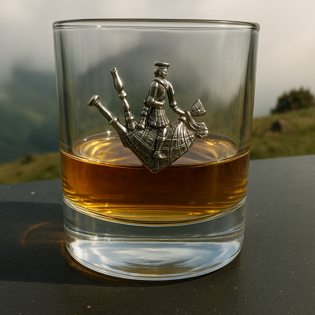 Celebrate Scottish charm with our distinctive whisky glass, Expertly crafted by AE Williams, this Scottish whisky glass boasts a pewter design of iconic highland symbols - the cow, stag, and thistle. Enjoy your favorite whisky in style and honor Scottish heritage with this unique and elegant glass., this 9.5cm tall glass holds a generous 280 ml. Each tumbler comes in a gift box.