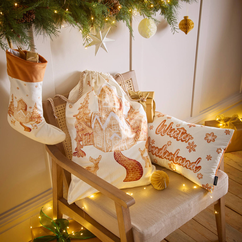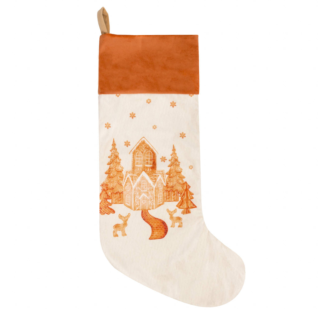 The Gretel Christmas Stocking adds festive charm with its printed velvet design featuring a gingerbread village. Its warm colors bring cozy holiday spirit to any room.