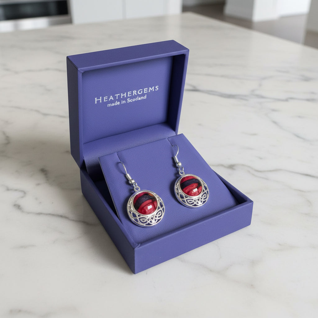 These silver plated earrings feature a celtic twist - an iconic image that celebrates Scotland's heritage. The gem is made from 100% hand harvested heather. This process helps rejuvenate the landscape and encourages new growth.