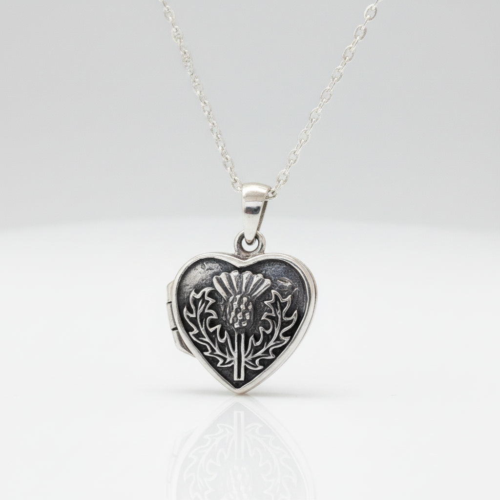 A beautifully crafted sterling silver locket showcasing a thistle design with a subtle heart motif, inspired by Scotland’s iconic national flower. This elegant piece is ideal for anyone who cherishes Scottish heritage and its timeless symbolism.