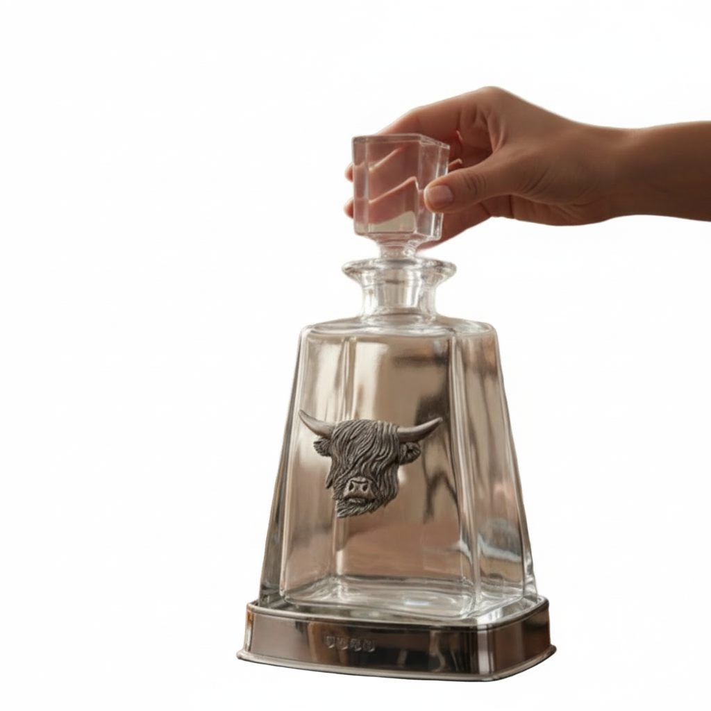 Upgrade your home bar with this exquisite Highland Cow Thistle Pewter Glass Whisky Decanter from AE Williams.